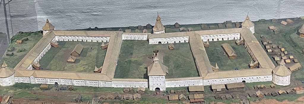 Maquette de l’ancien Gostiny Dvor: il est fortifié de l’extérieur mais se développe à l’intérieur. Ce type de construction se retrouve aussi dans les kremlins, sorte de cité fortifiée où se trouvent les principaux bâtiments administratifs et religieux