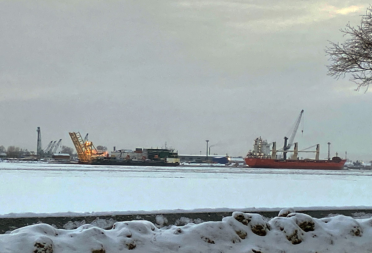 « Ce qui m’a surtout impressionnée, c’est le fleuve, la Sévernaya Dvina (Dvina du nord) qui se jette dans la mer Blanche. Le fleuve gèle pendant l’hiver, mais reste navigable grâce aux petits brise-glace qui créent le passage pour toutes sortes de bateaux, petits et grands. Je voulais voir le chouga, un mélange de glace et d’eau, une vraie soupe que les bateaux doivent traverser. Je l’ai vu ! Impressionnant !